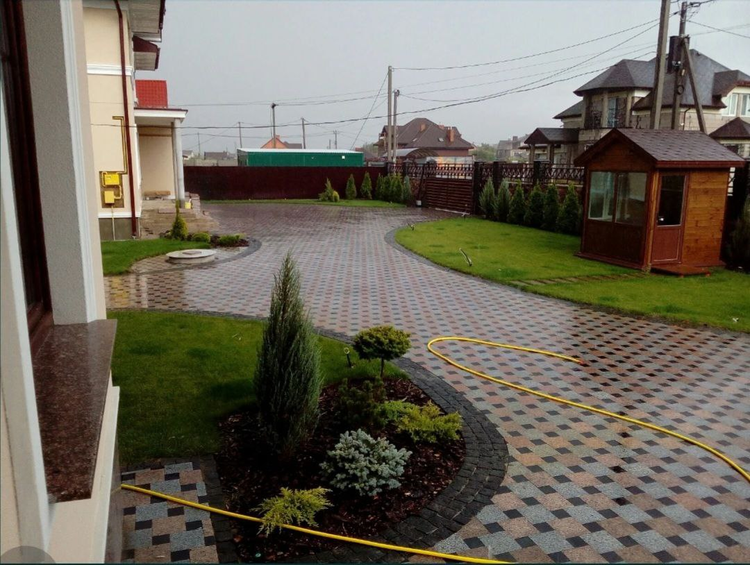 Благоустрій території приватної резиденції виконано з використанням світло-сірого граніту Grey Ukrainian та червоного граніту Maple Red. Доріжки викладено гранітними плитами розміром 30×30×3 см, а також пилянною гранітною бруківкою 20×10×3 см і 10×10×3 см.