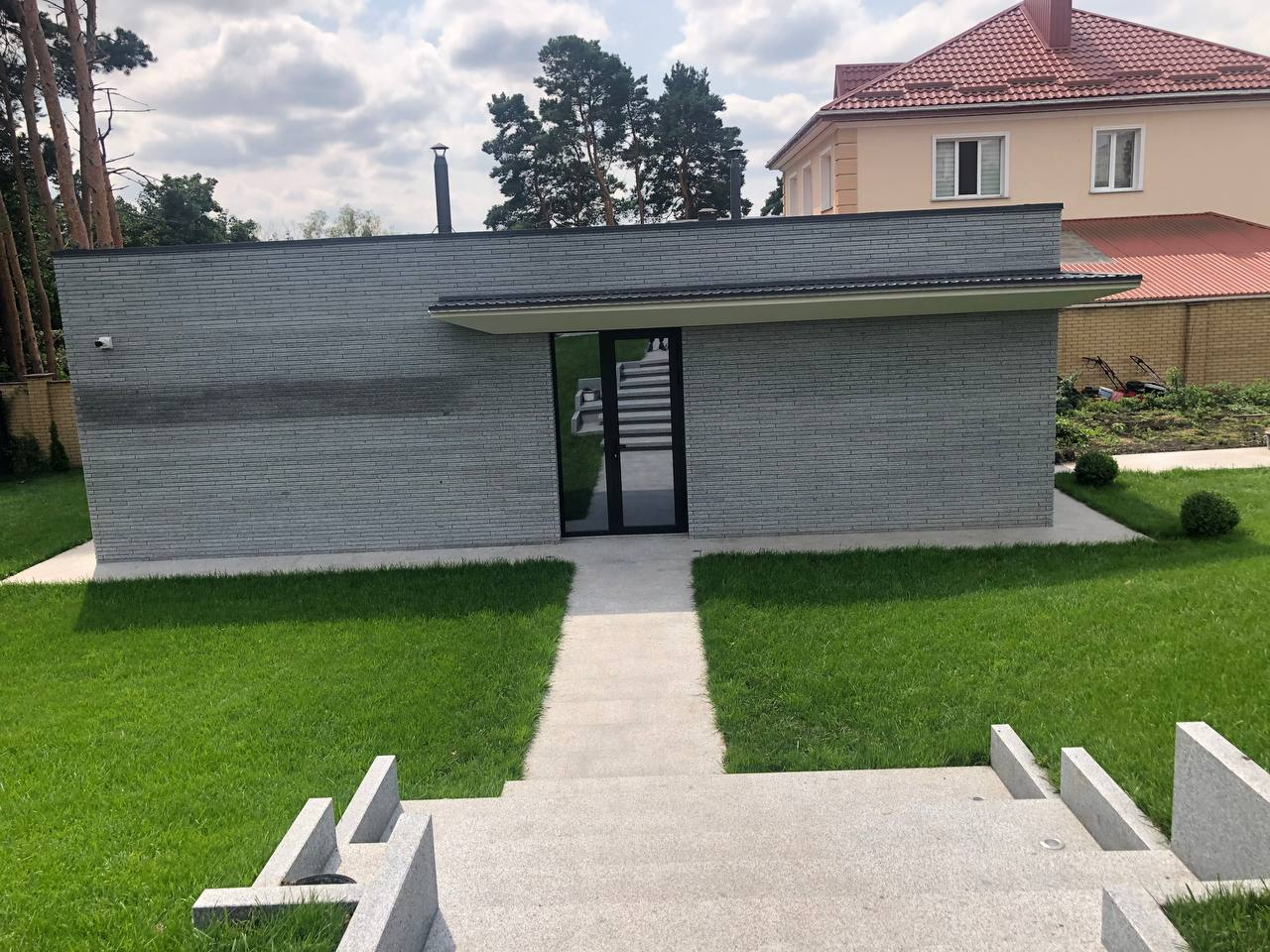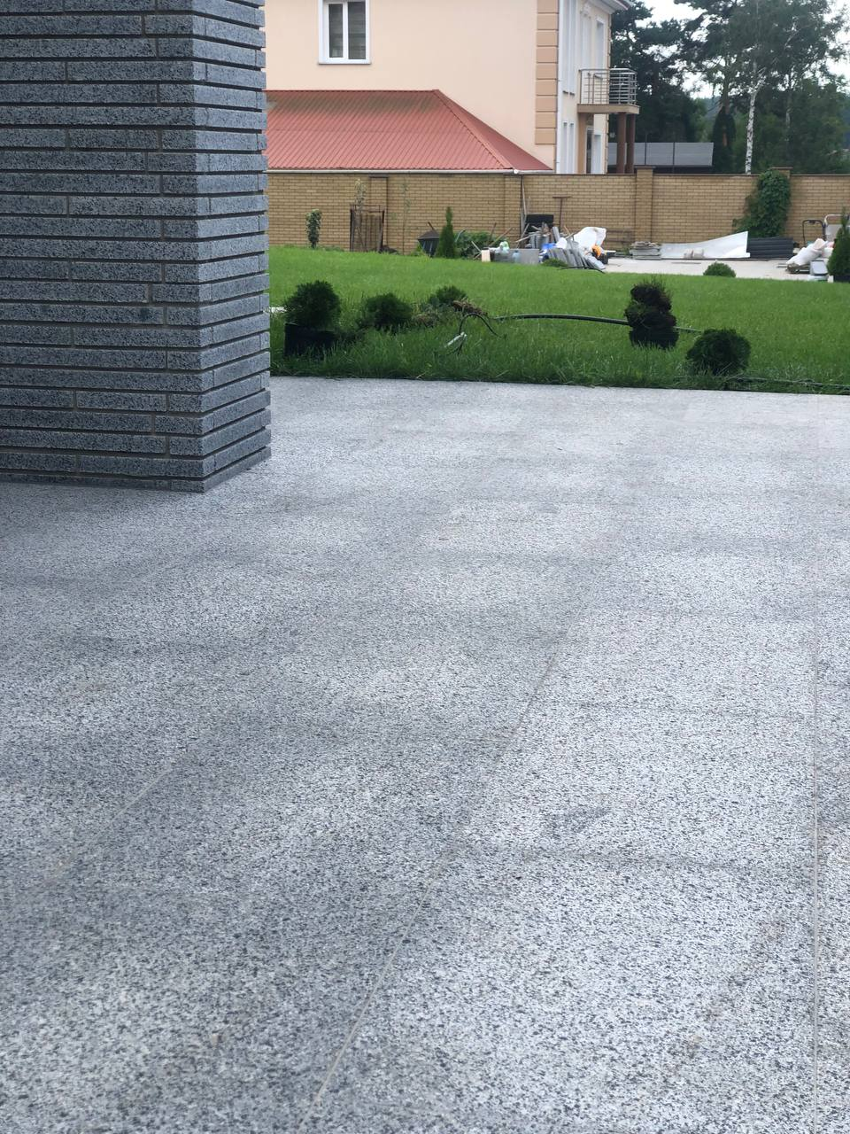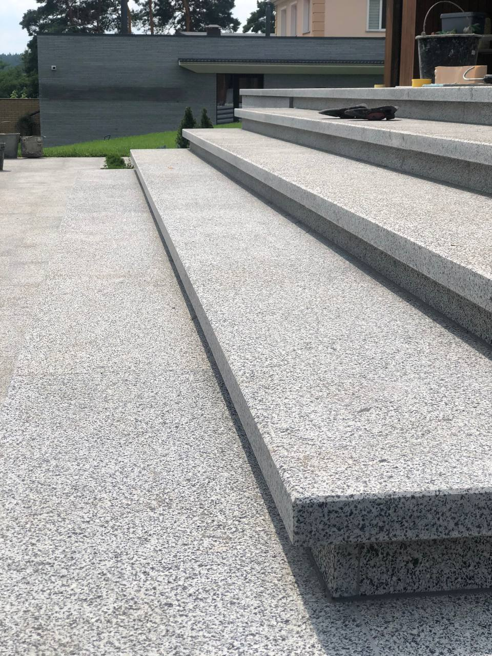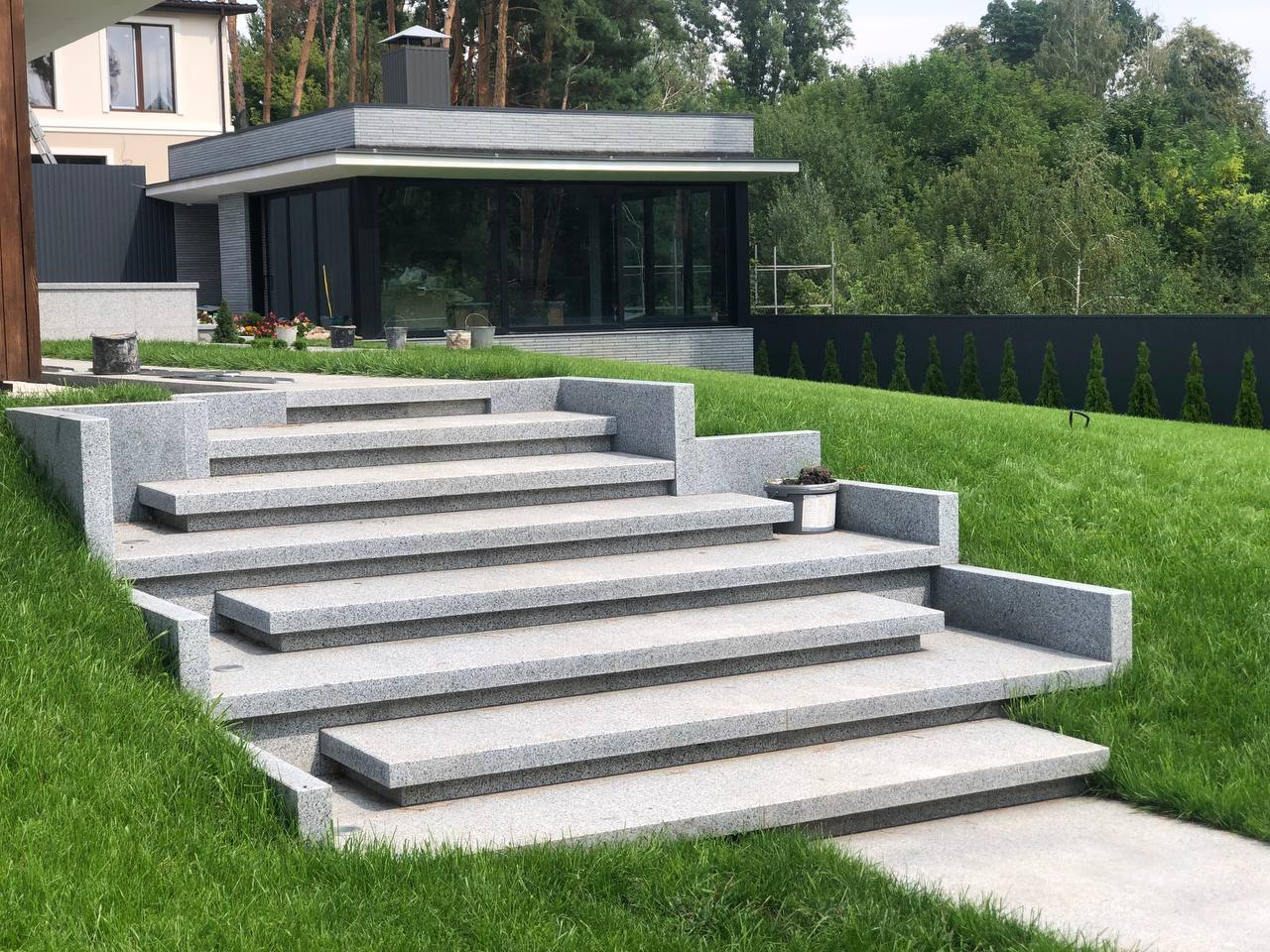 Для облаштування території приватної резиденції використано світло-сірий граніт Grey Ukrainian. Огорожу та фасади будівель на ділянці облицьовано пилянною гранітною смугою, що надає архітектурну цілісність усьому ансамблю. Прогулянкові доріжки та терасу викладено гранітними плитами різних розмірів, а сходи також виконано зі світло-сірого граніту, що забезпечує довговічність і естетичну гармонію простору.