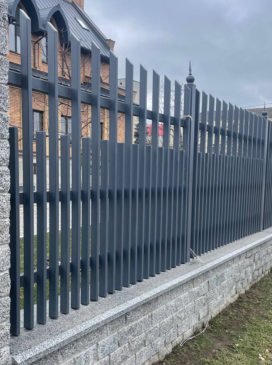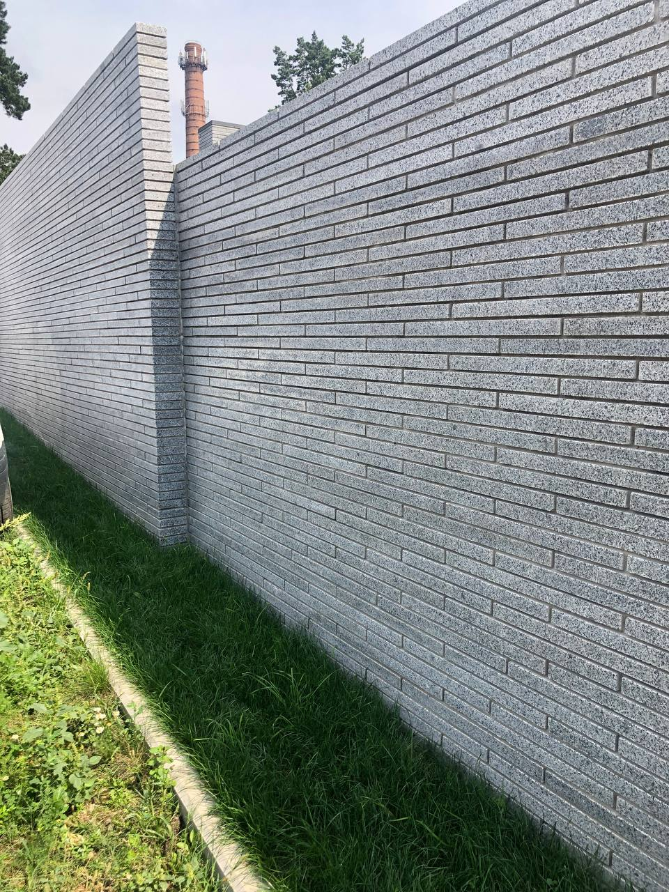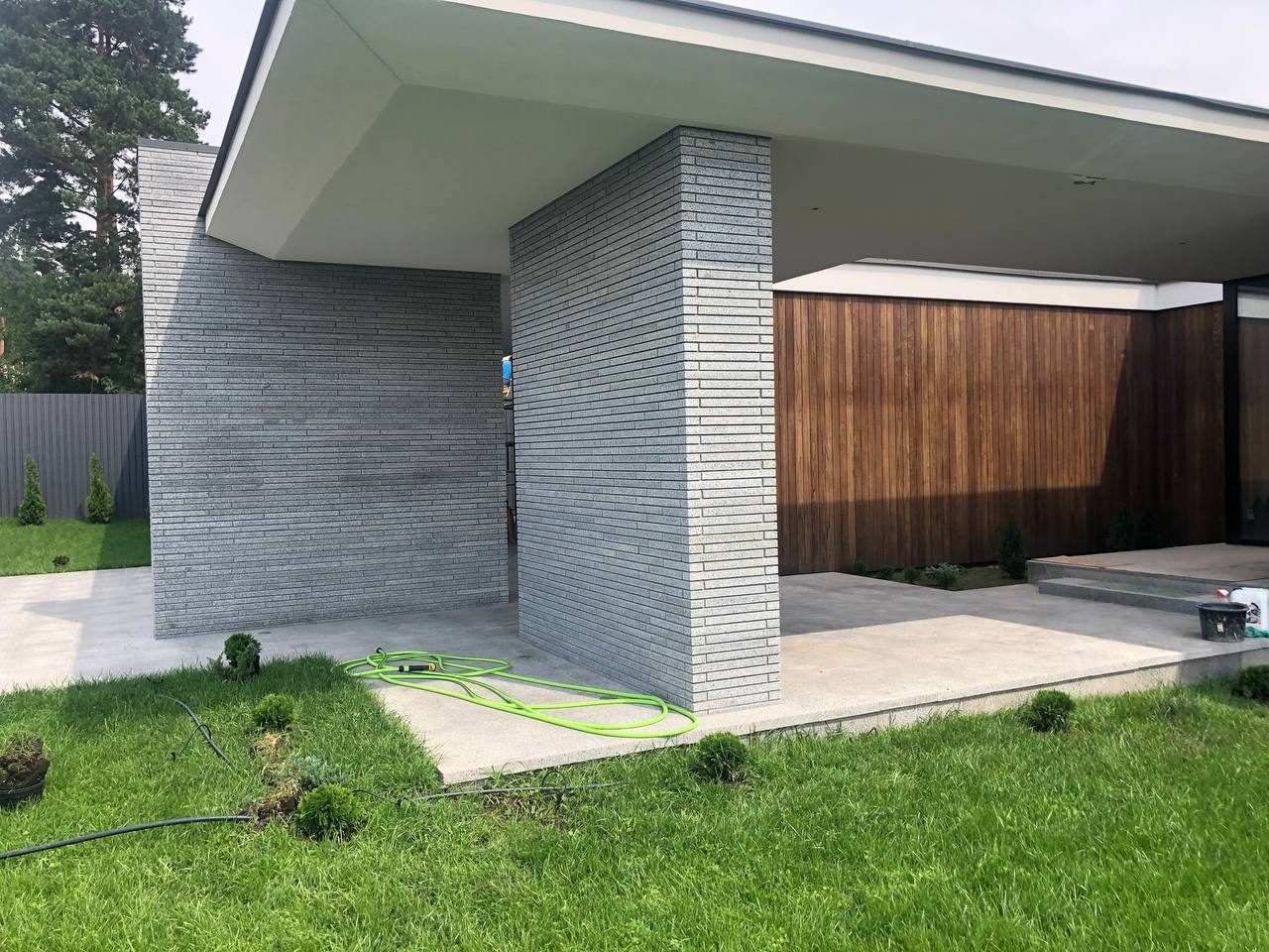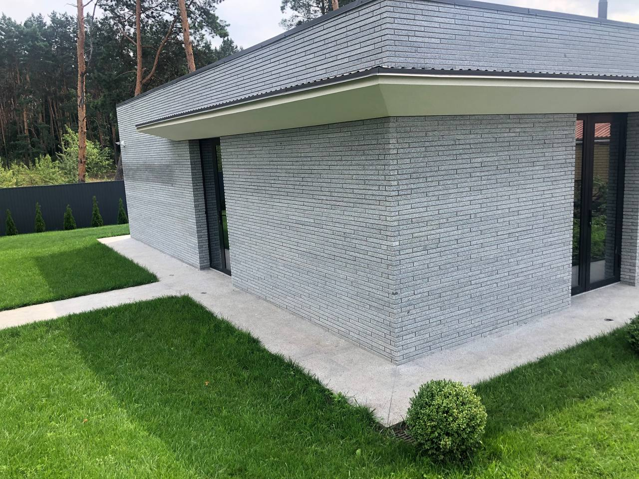 Для облаштування території приватної резиденції використано світло-сірий граніт Grey Ukrainian. Огорожу та фасади будівель на ділянці облицьовано пилянною гранітною смугою, що надає архітектурну цілісність усьому ансамблю. Прогулянкові доріжки та терасу викладено гранітними плитами різних розмірів, а сходи також виконано зі світло-сірого граніту, що забезпечує довговічність і естетичну гармонію простору.