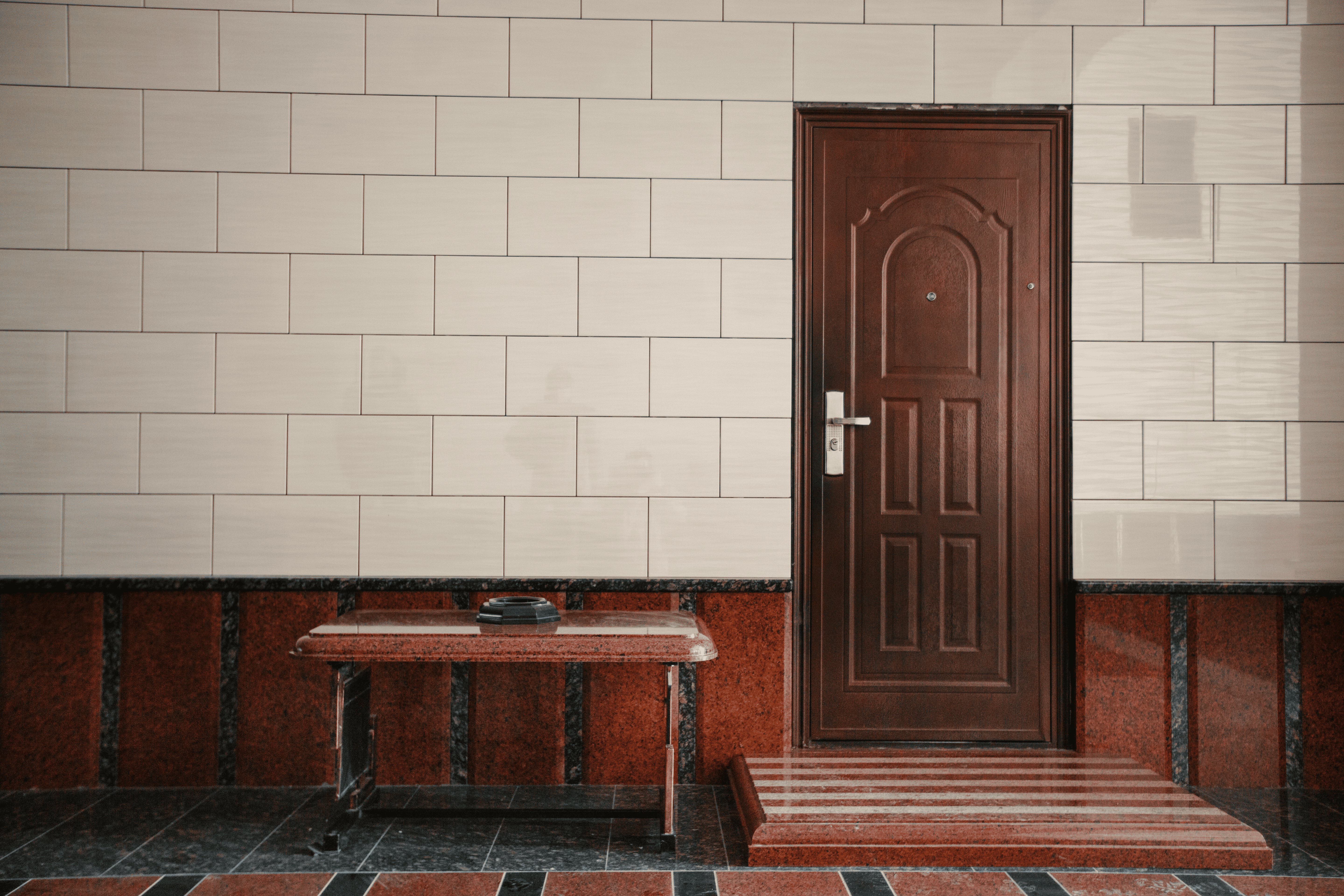 Оздоблення холу виконано із застосуванням червоного граніту Maple Red, чорного граніту Gabro та світло-сірого граніту Grey Ukrainian. Підлогу викладено червоними гранітними плитами (30×30×3 см), пилянною гранітною бруківкою чорного кольору (20×10×3 см) і світло-сірого (10×10×3 см). Стіни оздоблено світло-сірими гранітними плитами (60×30×3 см), що надає інтер’єру солідного й елегантного характеру.