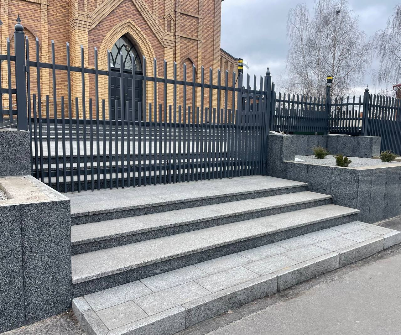 Територію храму облаштовано із застосуванням світло-сірого граніту Grey Ukrainian, що надає простору витонченості та елегантності. Огорожа виконана з гранітної бруківки (20×10×3 см), яка підкреслює вишуканий характер, а між стовпами встановлено металеві секції сірого кольору, що додають сучасності й гармонійно поєднуються з архітектурою храму. Доріжки викладені термообробленими гранітними плитами розміром 30×30×3 см і 60×30×3 см.